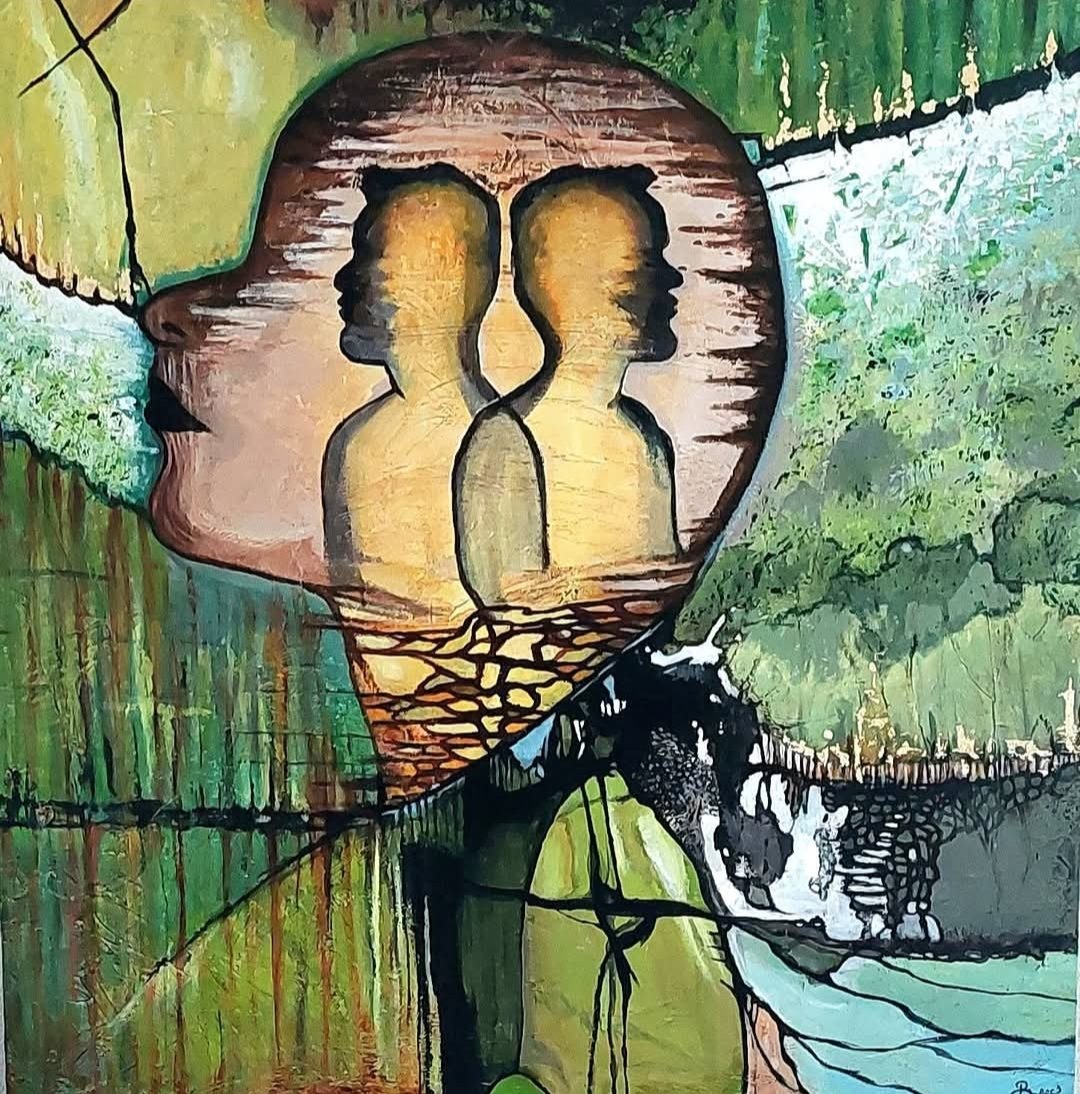 Acrylverf en structuurpasta op een 3D canvasdoek.